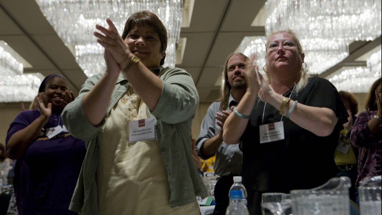 A scene from the Union Delegate Conference on the 2008 reopener agreement, a run up to the 2010 National Agreement.