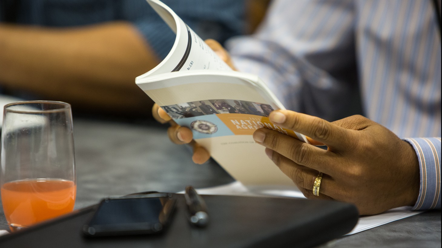 A participant in 2015 National Bargaining consults the 2012 contract. Each National Agreement has built on the groundbreaking provisions of the previous agreement.