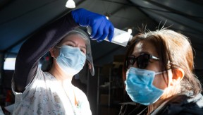 3 health care workers wearing PPE, with Vax to the Future headline
