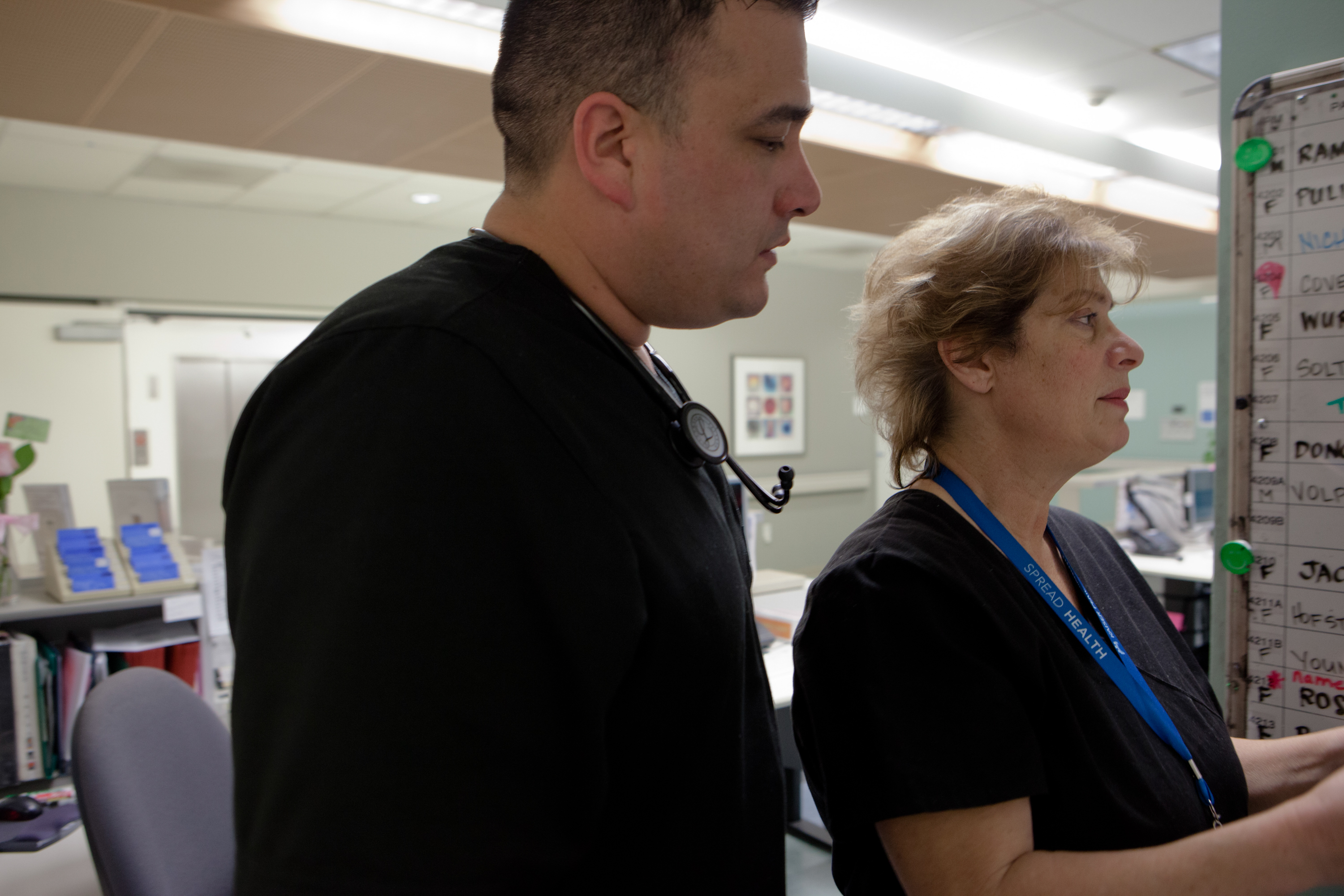 Eric Zambrano, left, RN, UNAC/UHCP with Demetria Verna, ward clerk/transcriber, SEIU UHW