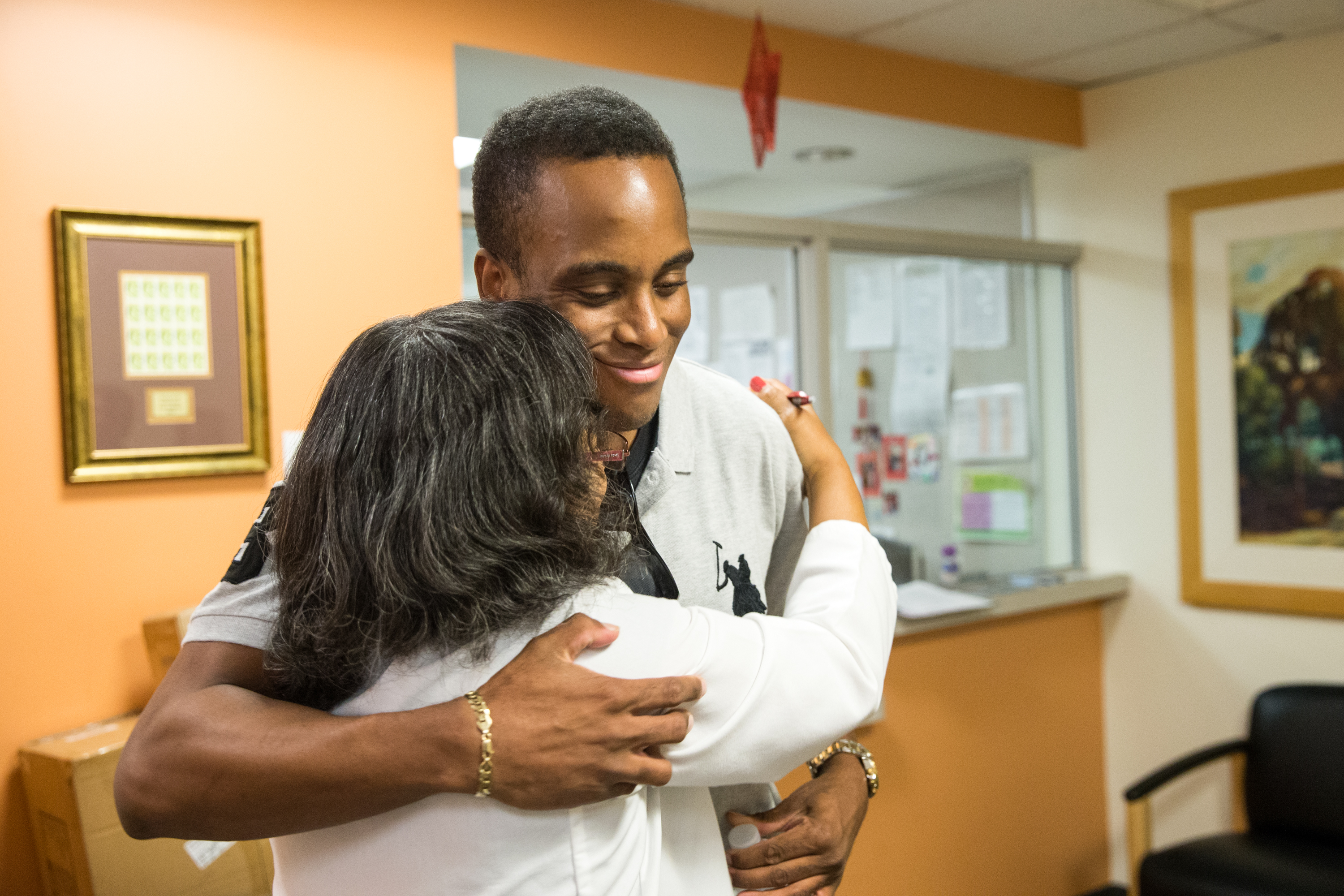 Brandon Johnson, a Kaiser Permanente member, gives Shirley Brown, RN, a member of UNAC/UHCP, a grateful hug.