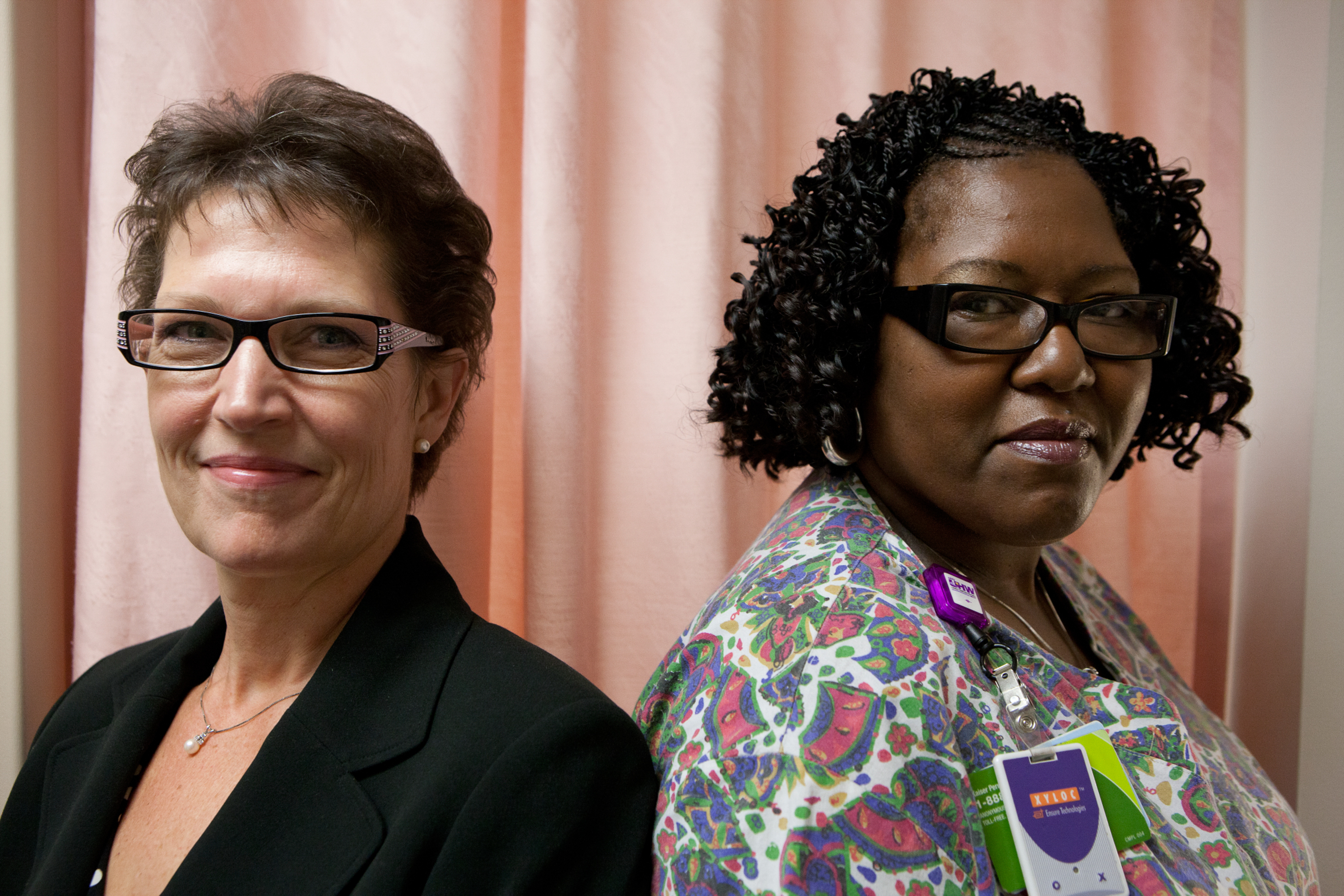 San Jose Ob/Gyn co-leads Kathleen Kearney, manager, and Glenda Morrison, receptionist and SEIU UHW shop steward.
