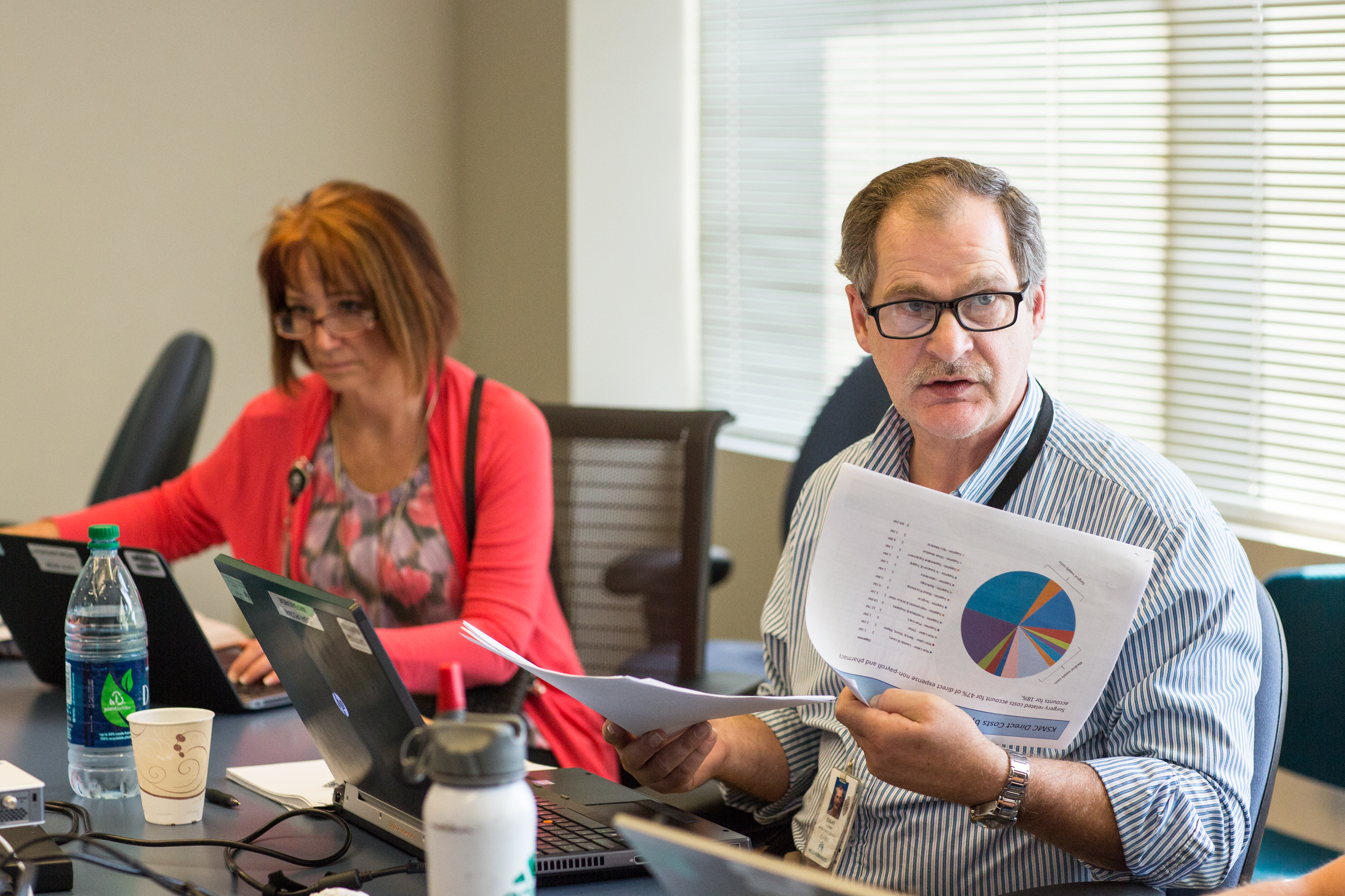 Ed Vrooman, a union partnership representative from SEIU Local 49, helps teams demystify the data so numbers can be a portal to improved performance instead of a source of stress. Kate Webb, project coordinator, lends a hand.