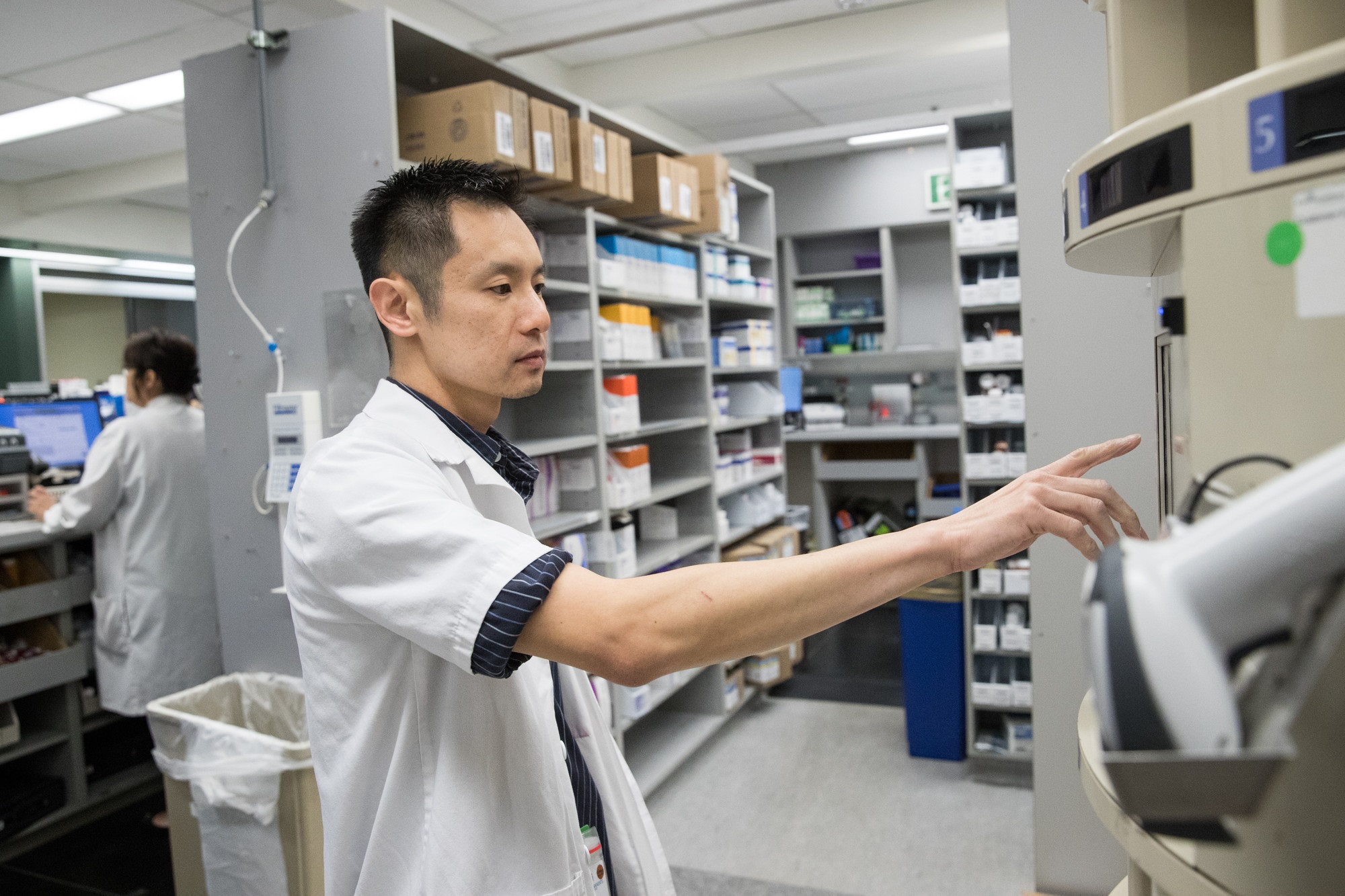 Angel Nguyen, an ambulatory care pharmacist and member of UNAC/UHCP, works with Wesley Frani, a pharmacy assistant and a member of UFCW Local 135, to monitor stock levels.