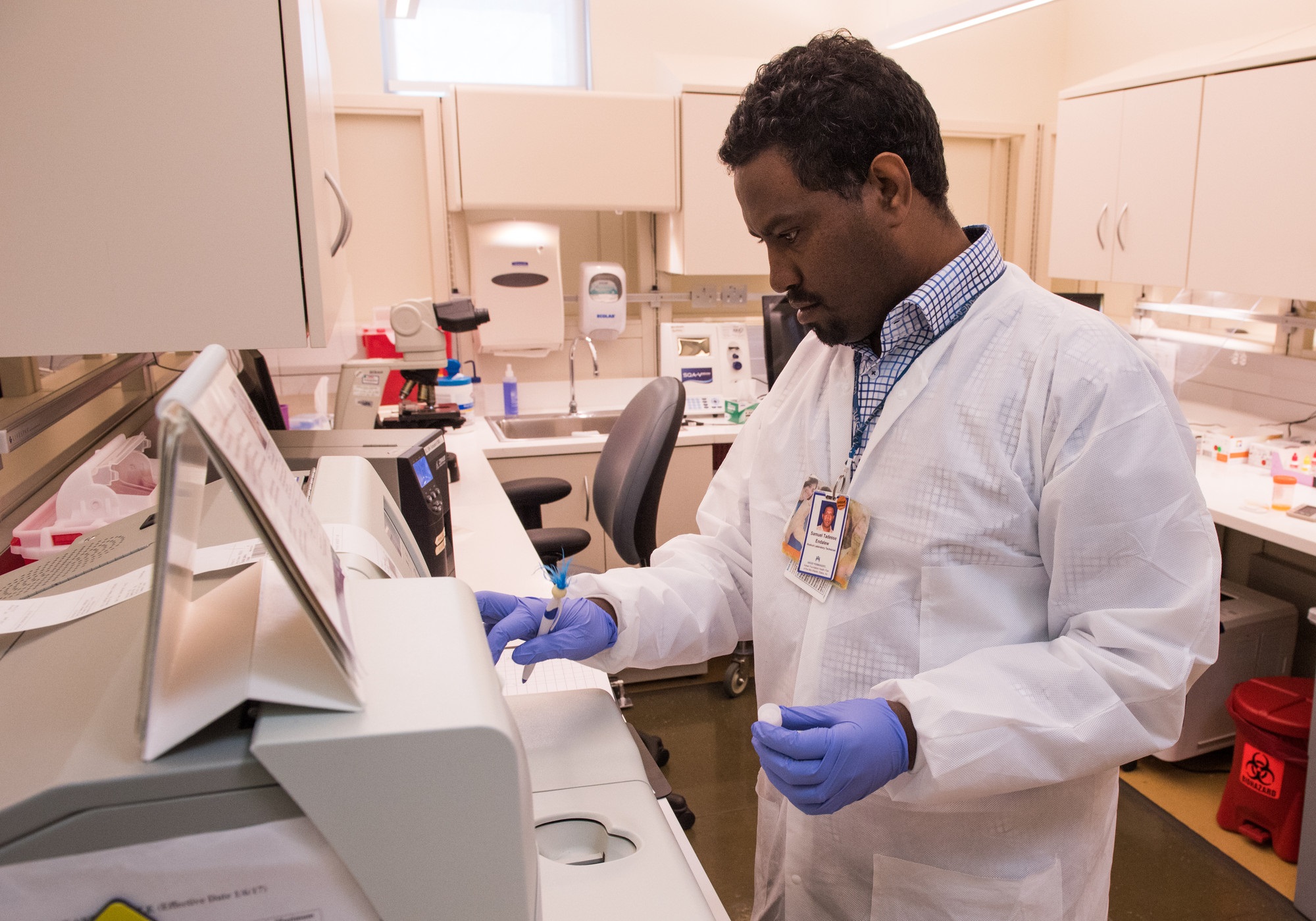 Samuel Endalew, lead technician and member of UFCW Local 27, helped his team figure out a way to reduce missed lab orders, which saves money and respects patients' time.