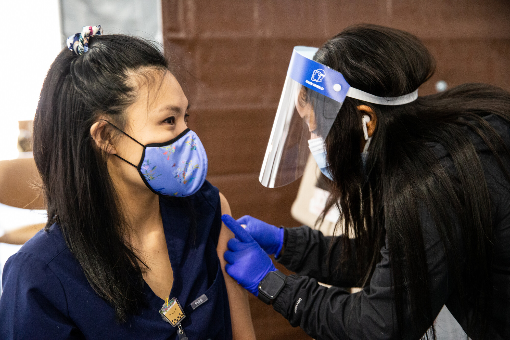 Taking our shots: Collaborative efforts between labor and management, such as at this Kaiser Permanente vaccination tent in Northern California have helped increase COVID-19 vaccinations. Alia Easy, an LVN and member of SEIU-UHW, gives pediatrician Dr. Christabelle Co her vaccine.