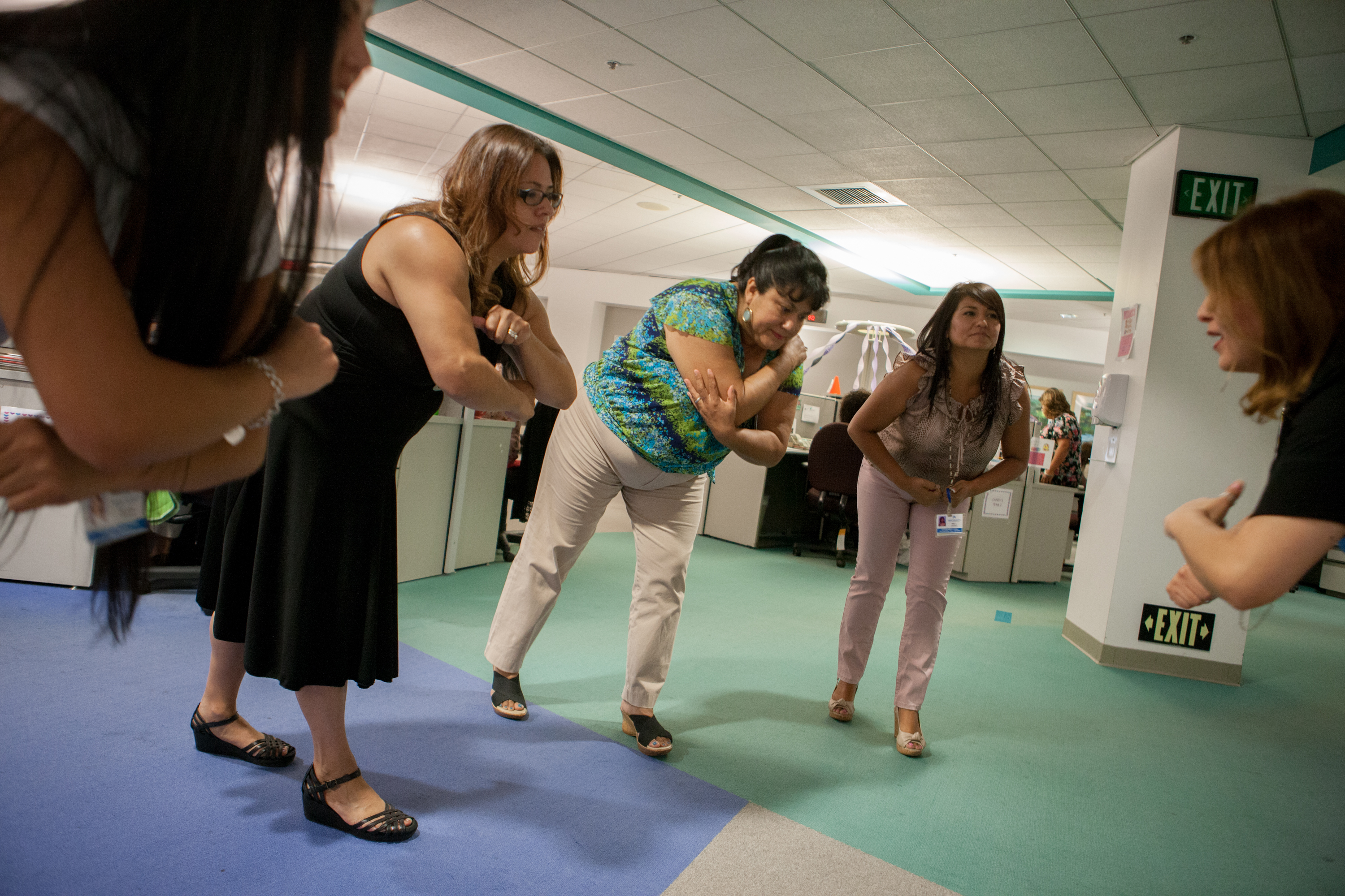 At 10:30 a.m. sharp, South Bay Medical Center appointment clerk Carolina Meza removes her telephone headset. She fires up what looks like the world’s tiniest iPod, attached to a portable speaker that’s not much bigger. She gathers four of her co-workers in a patch of open space near the coffee room. They do some neck rolls, march in place and then do a move Meza calls “the incredible hulk”—a shoulder stretch that brings welcome relief to those facing a computer screen for most of their day.