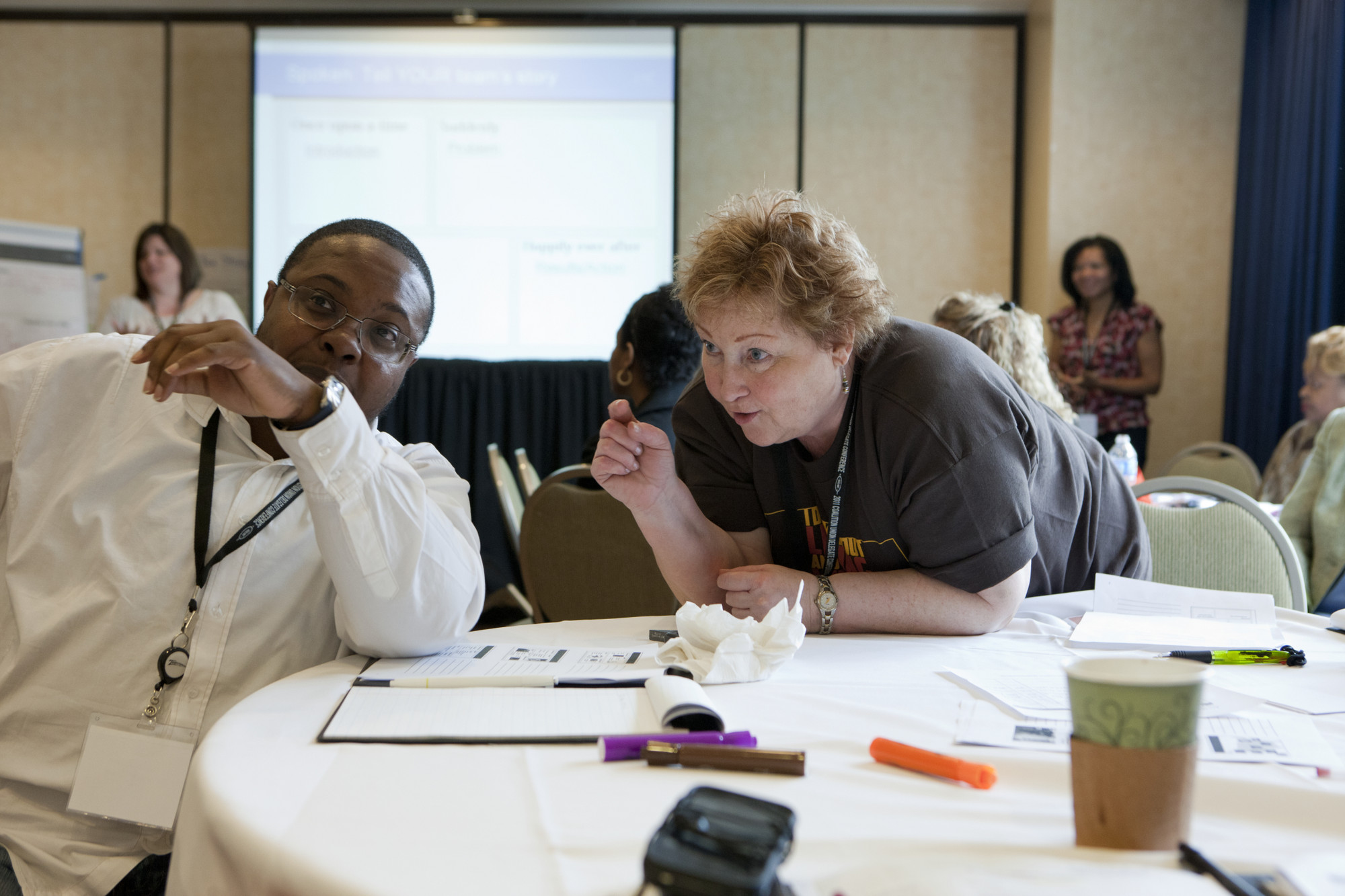Talking it through helped a San Jose pediatric unit increase morale. Pictured here, Sean Saxton, HNA/OPEIU Local 50 (left) and Shelby Lyons SEIU Local 105, discuss communication skills at a Delegate Conference workshop.