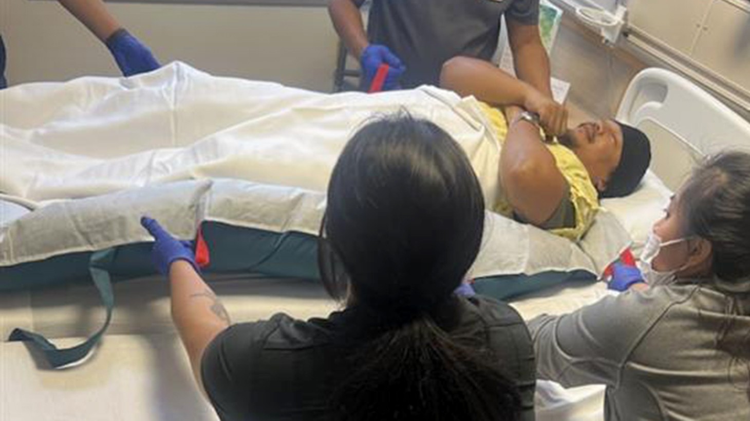 A team works together to move a patient using a HoverMatt, an inflatable air mattress designed to make patient transfers easier and safer. Frequent repositioning of patients helps prevent pressure ulcers, which are costly to treat. By facilitating easier movement, HoverMatts help reduce the incidence of pressure ulcers—ultimately saving Kaiser Permanente money.