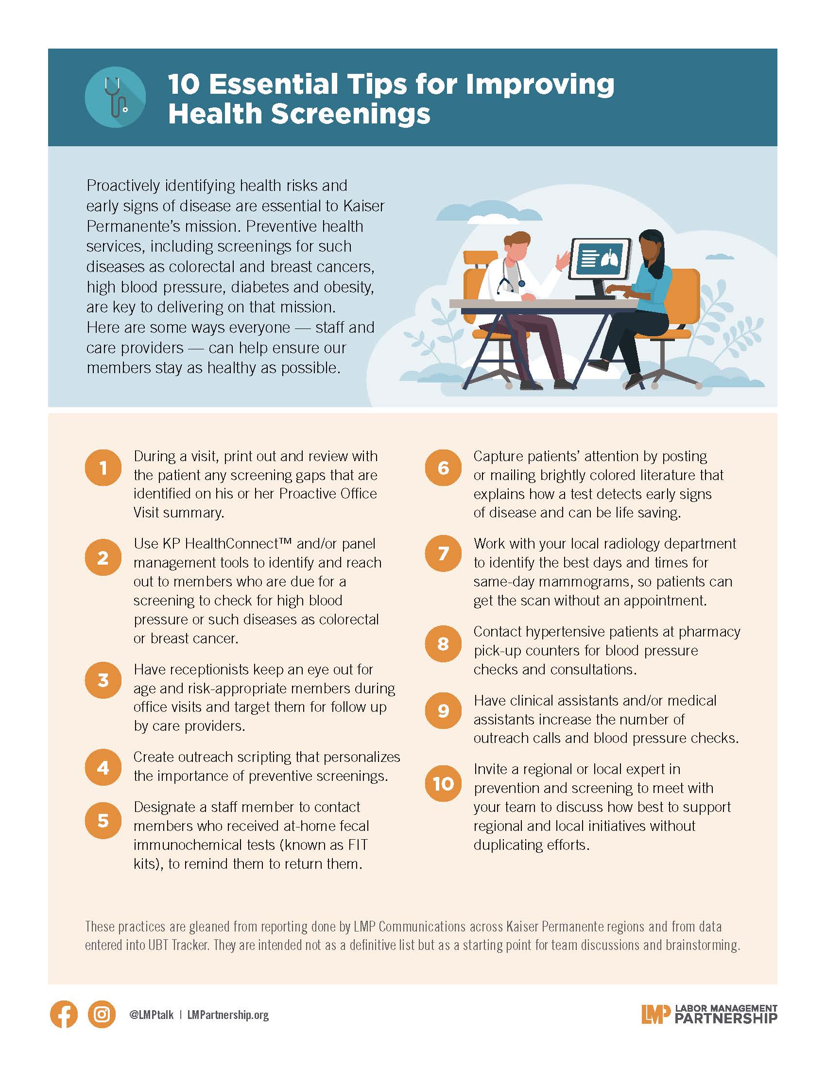 Use this tipsheet with ideas to increase patients' health screenings on bulletin boards, to prompt discussion at team meetings and as a starter for performance improvement projects.