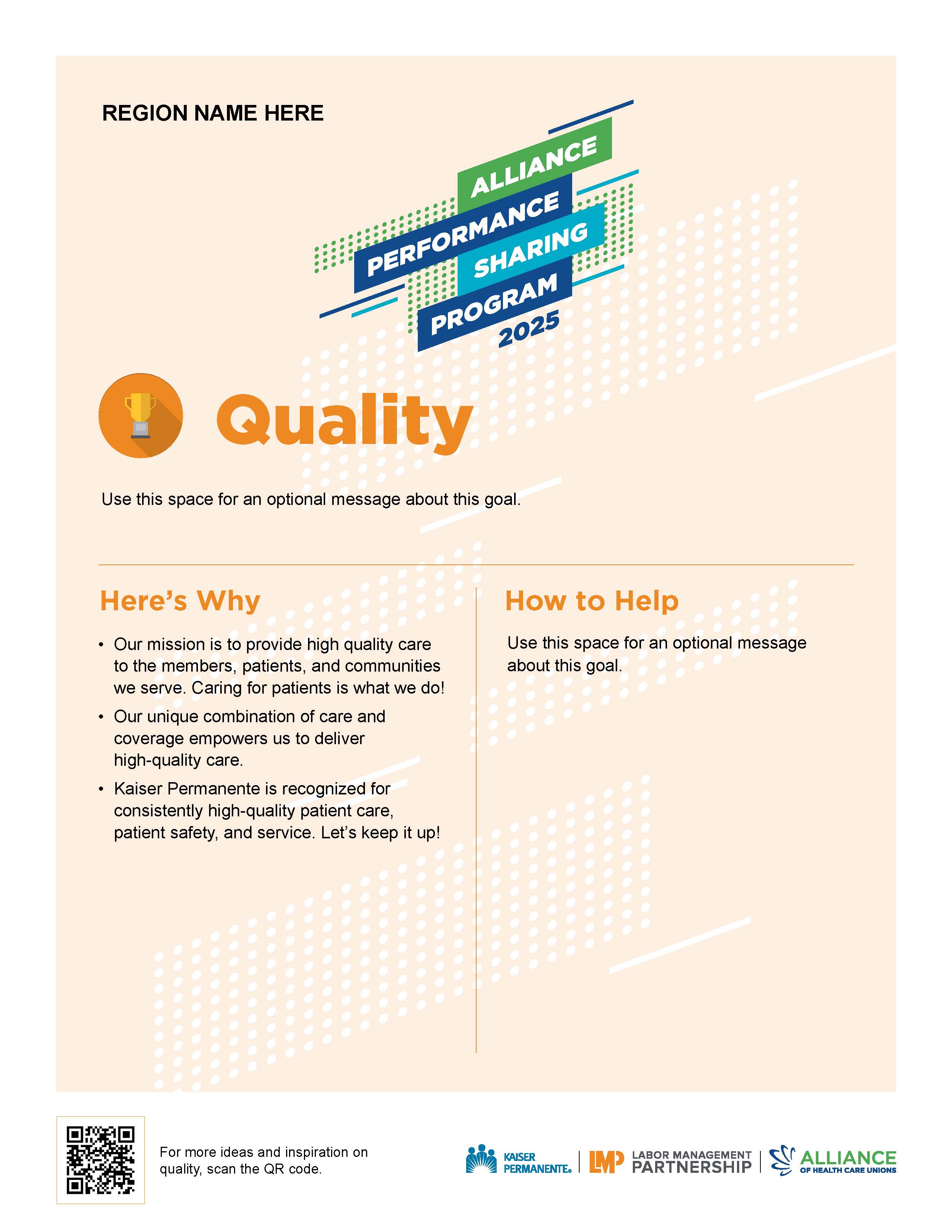 Best used: Customize this poster template by adding concrete steps that unit-based teams can take to meet the 2025 Alliance PSP goal for quality. Fill out the template and download a customized poster to hand out at meetings or post on bulletin boards where frontline employees gather.