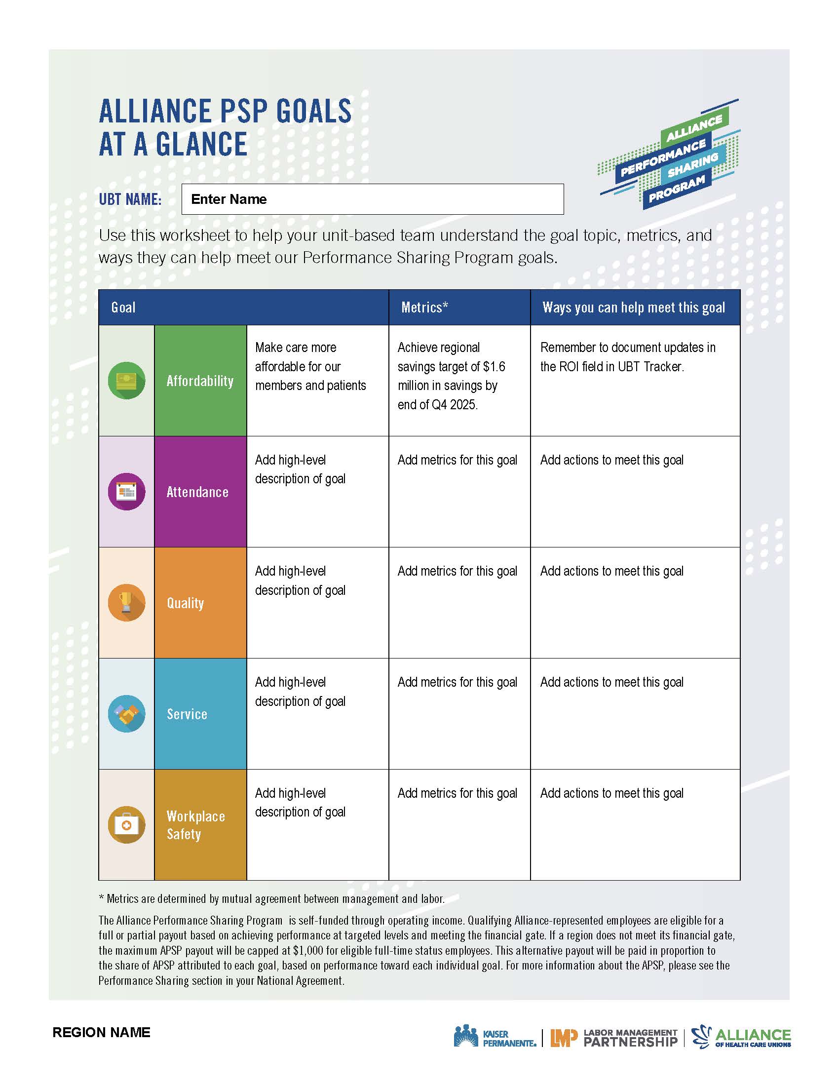 Best used: Use this fill-in-the-blanks template to help your unit-based team understand the goal topic, metrics, and ways they can help meet our Alliance Performance Sharing Program goals. Fill out the template and download a customized poster to hand out at meetings or post on bulletin boards where frontline employees gather.