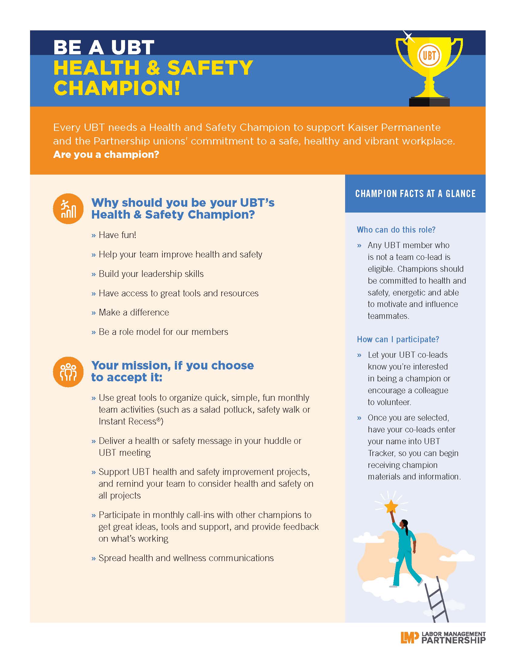 The 2015 National Agreement calls for every team to have a health and safety champion. This flier explains the role and encourages team members to volunteer. Share this flier at meetings and leave some in break rooms to encourage UBT members to volunteer to be your team's health and safety champion.
