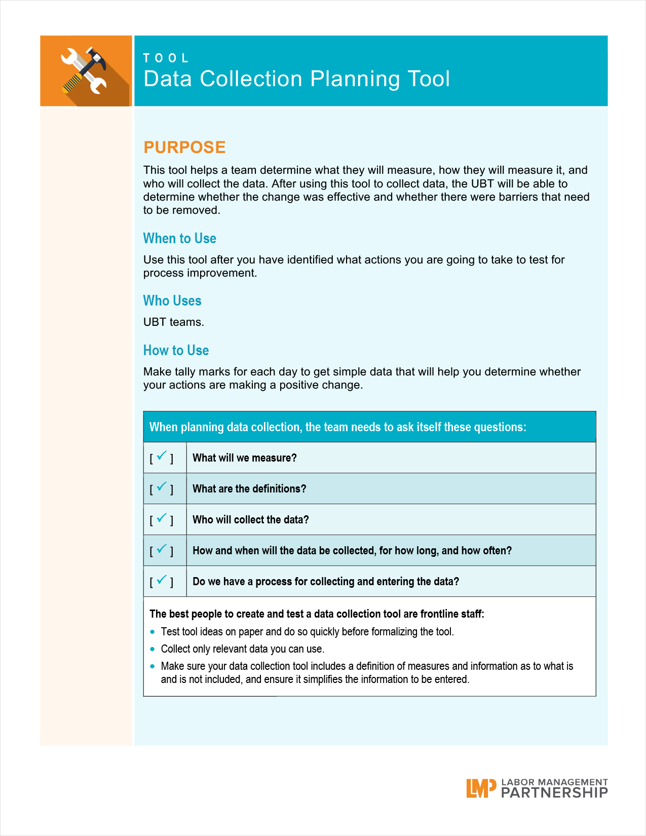 This worksheet will help determine data collection efforts and reporting to help teams decide whether the change was effective and whether there are barriers that need to be removed.