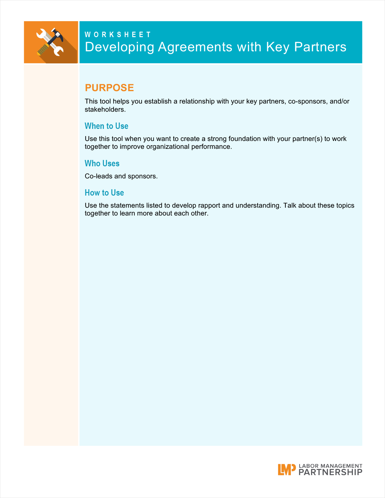 Use this tool when you want to create a strong foundation with your key partners, co-sponsors and/or stakeholders to work together to improve organizational performance.
