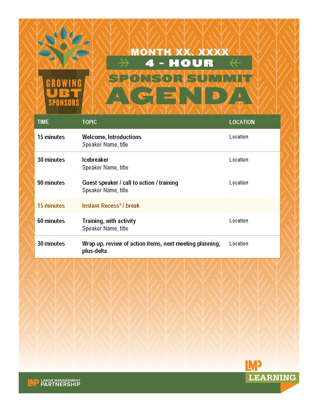 This editable template, designed with the Growing UBT Sponsors theme, makes it easy to put together the agenda for your half-day summit. All the text can be edited; click on "Month XX, XXXX" to get started!