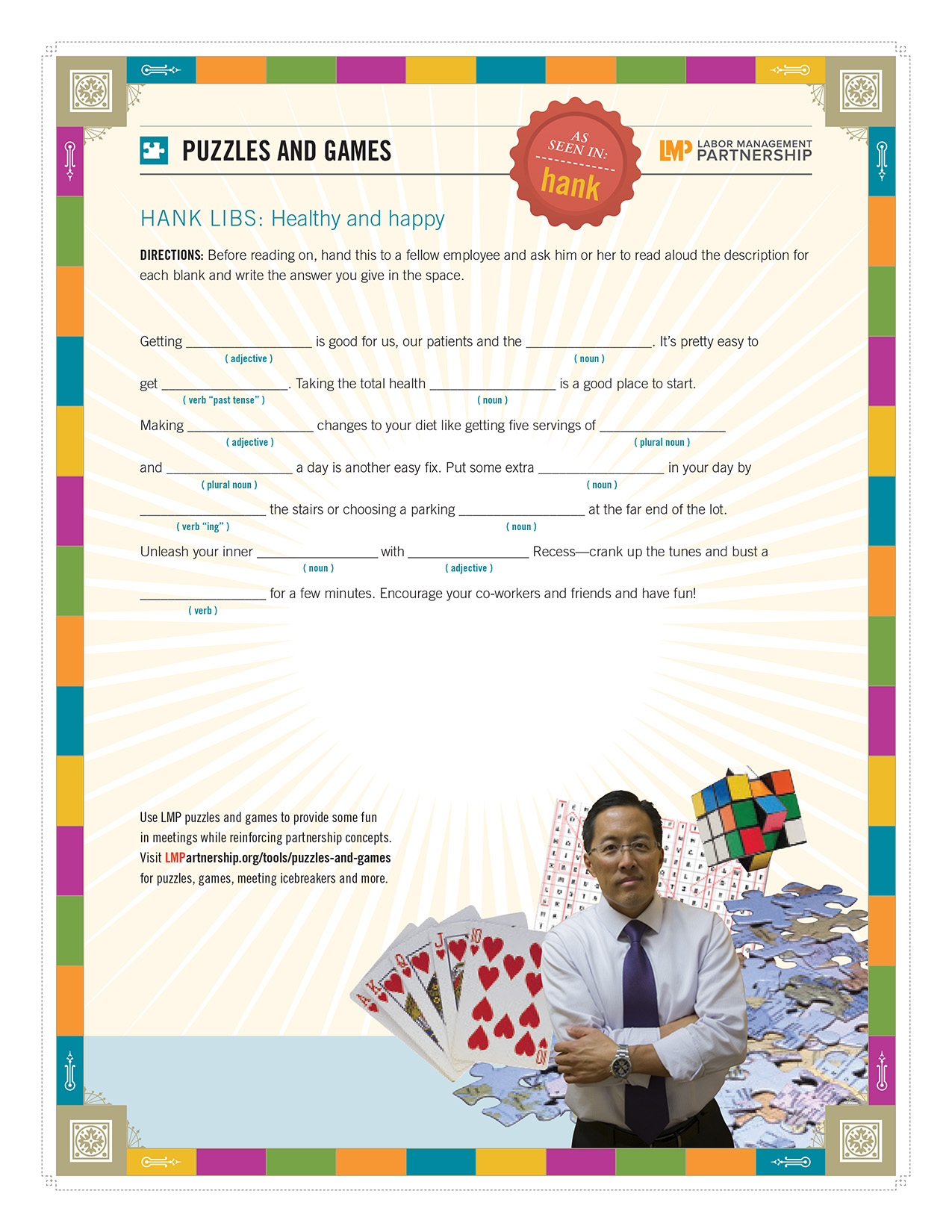 Use this Hank Lib to break up a team meeting with some fun—and at the same time, get people thinking about what they can do to get healthy.