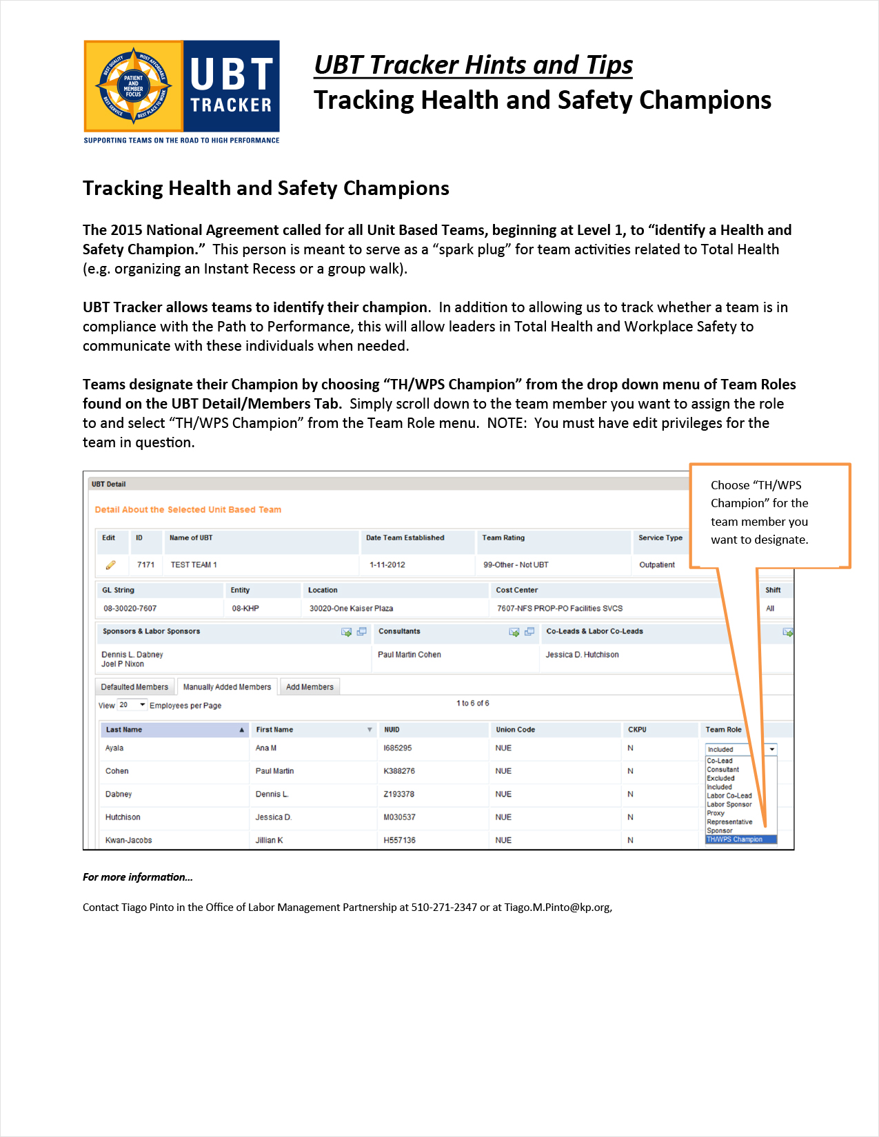 A colorful one-page instruction sheet with helpful screenshots providing step-by-step instructions on how to enter information about UBT health and safety champions into UBT Tracker.