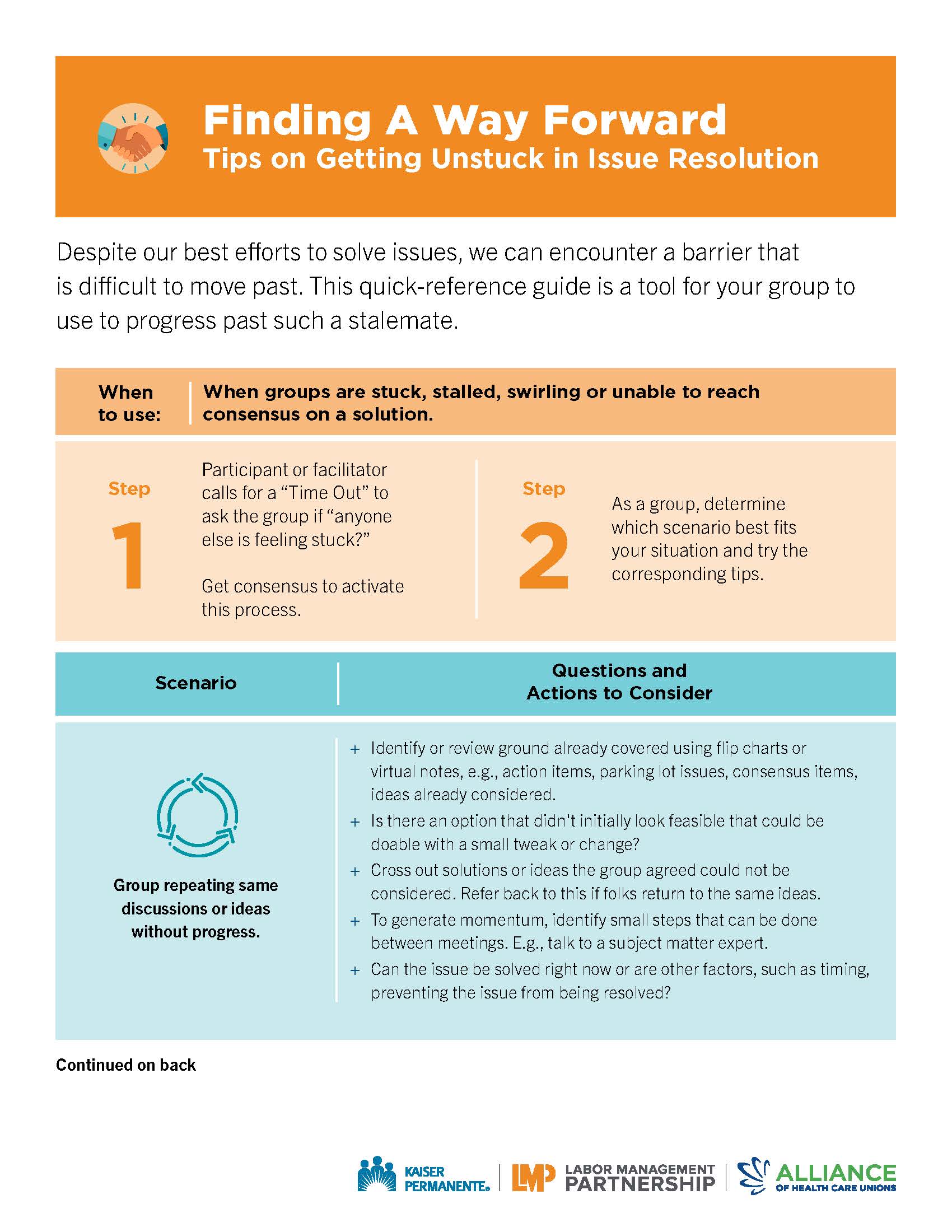Alliance-represented workers and Kaiser Permanente managers involved in an issue resolution who need help moving the group forward.