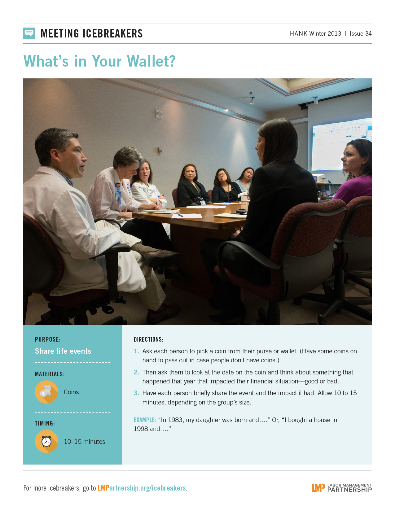 Use this meeting icebreaker to share life events with team members. From the Winter 2013 Hank.