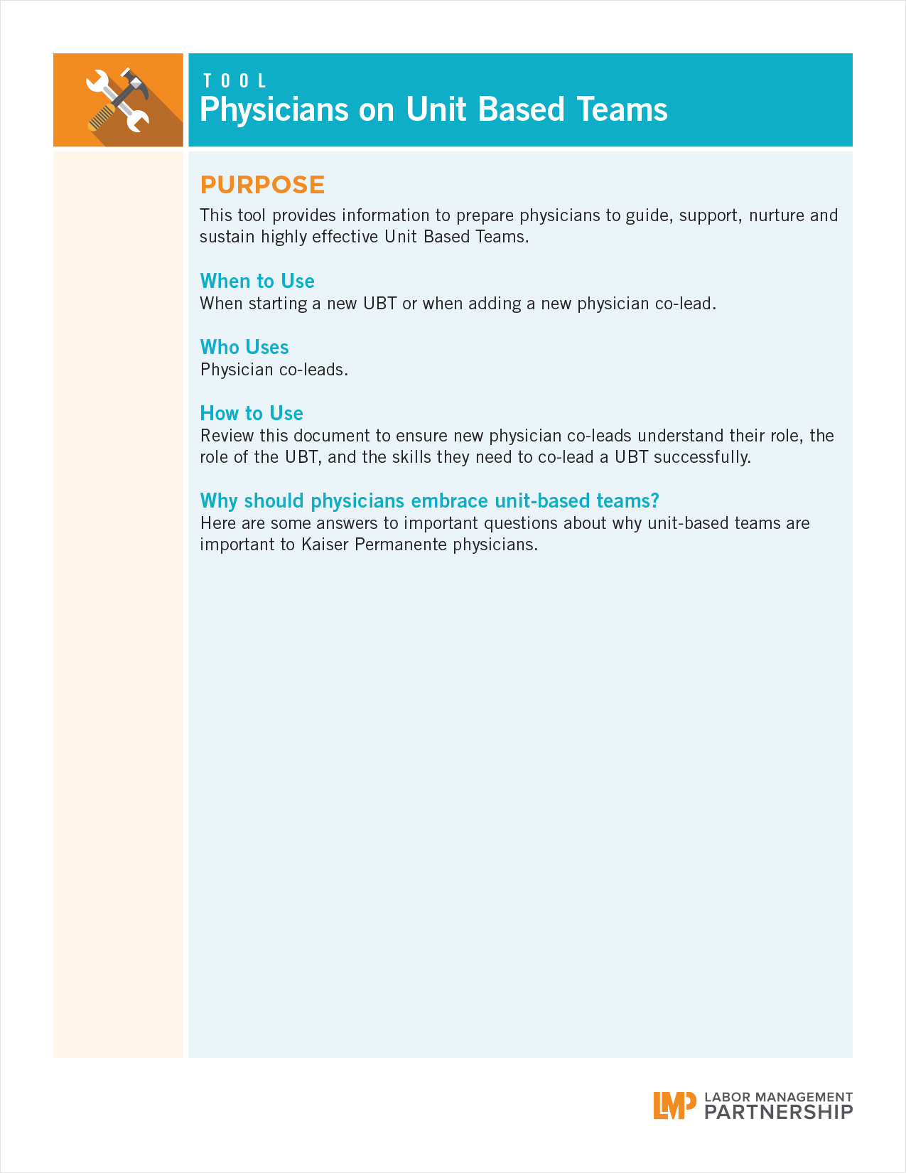 This tool provides information to prepare physicians to guide, support, nurture and sustain highly effective unit-based teams. Use when starting a new UBT or when adding a new physician co-lead.
