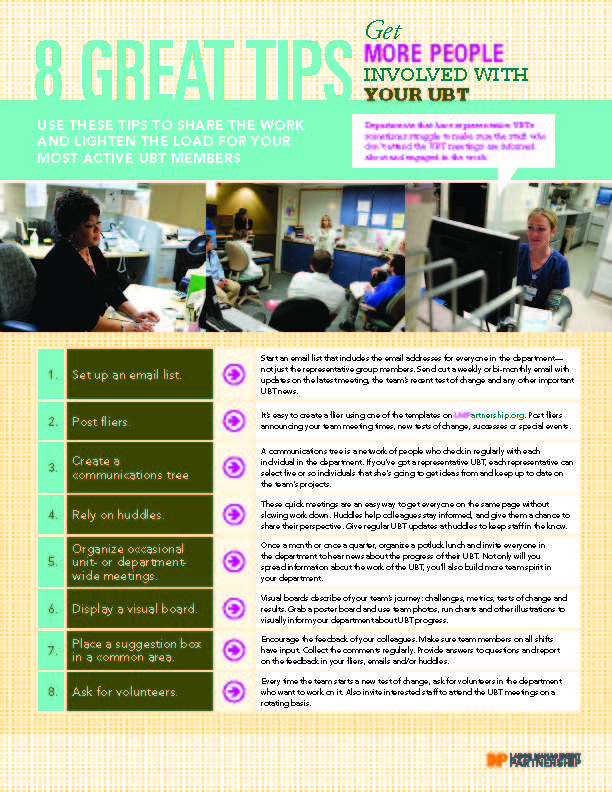 Share these tips on engaging and informing team members with your UBT on bulletin boards, in break rooms and in other staff areas.