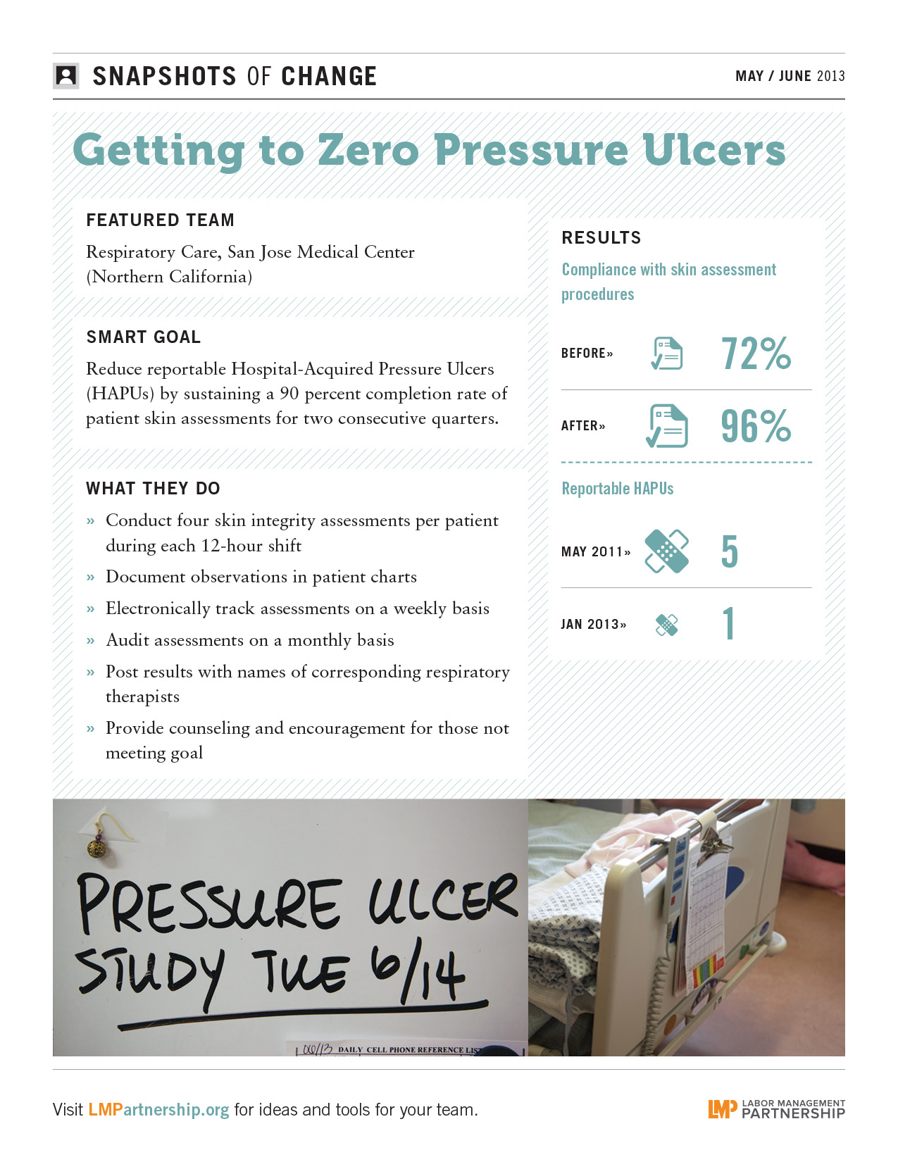 Post this in highly visible areas to show your staff how they can reduce pressure ulcers by following a few simple steps.