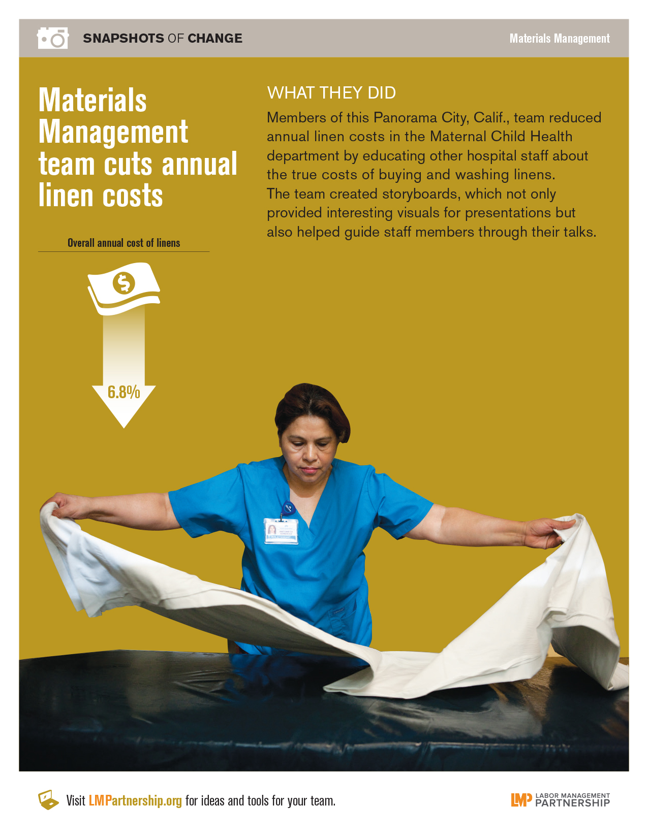 This poster, for use on bulletin boards in break rooms and other staff areas, features a Materials Management team that found a way to save in linen costs.