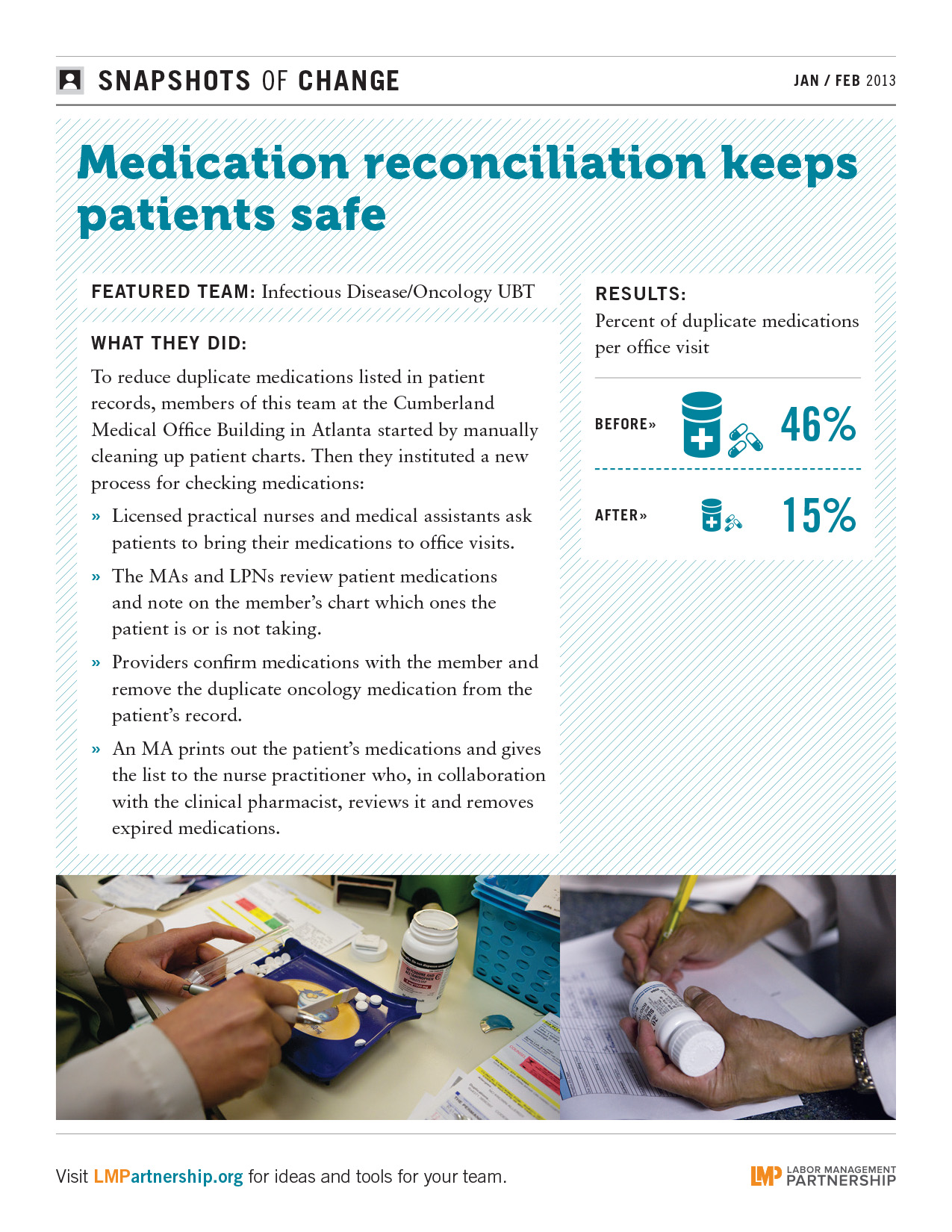 This poster highlights a Georgia team that reduced duplicate medications listed in patient records. Post on bulletin boards, in break rooms and other staff areas.