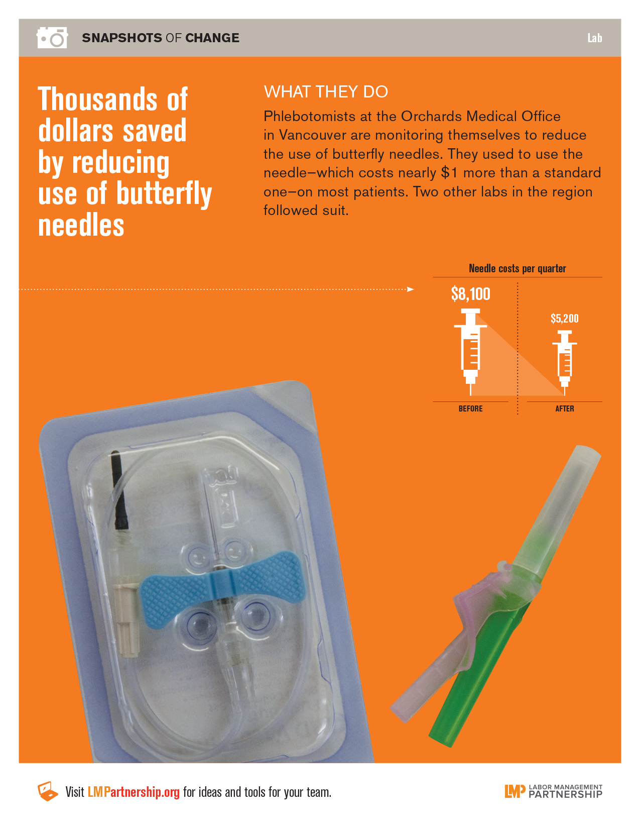 Share the story of this lab team that saved thousands by reducing the use of the butterfly needle on bulletin boards, in break rooms and in other staff areas.