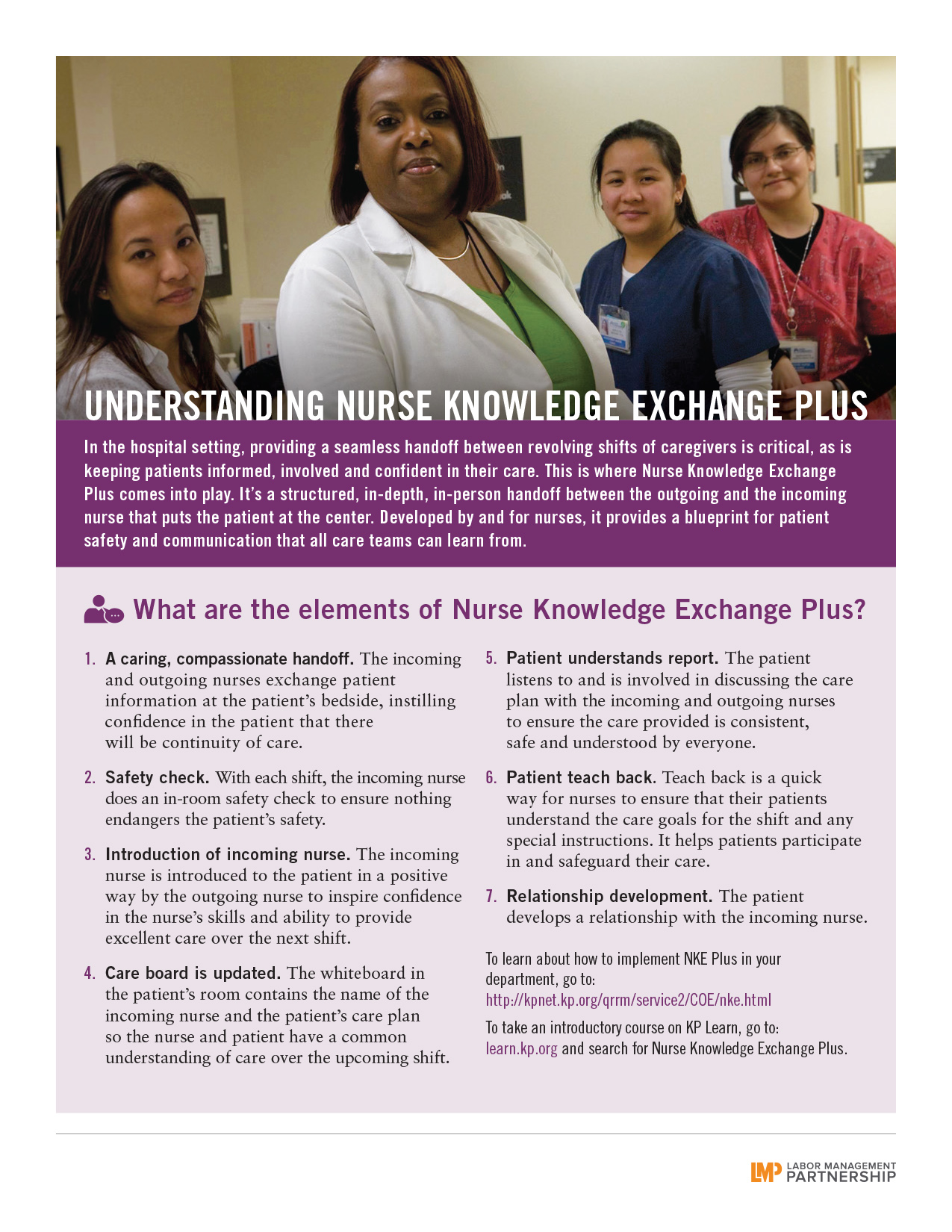 This poster highlights the elements of the Nurse Knowledge Exchange Plan, and can be posted on bulletin boards, in break rooms and other staff areas.
