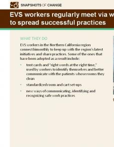 This PowerPoint slide highlights an EVS team that uses webinars to spread successful practices. Use in presentations to show some of the methods used and the measurable results being achieved by unit-based teams across Kaiser Permanente.