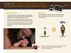 This Powerpoint slide highlights a team that increased the percentage of newborns spending at least 60 minutes with their mothers in skin-to-skin contact right after birth. Use in presentations to show some of the methods used and the measurable results being achieved by unit-based teams across Kaiser Permanente.