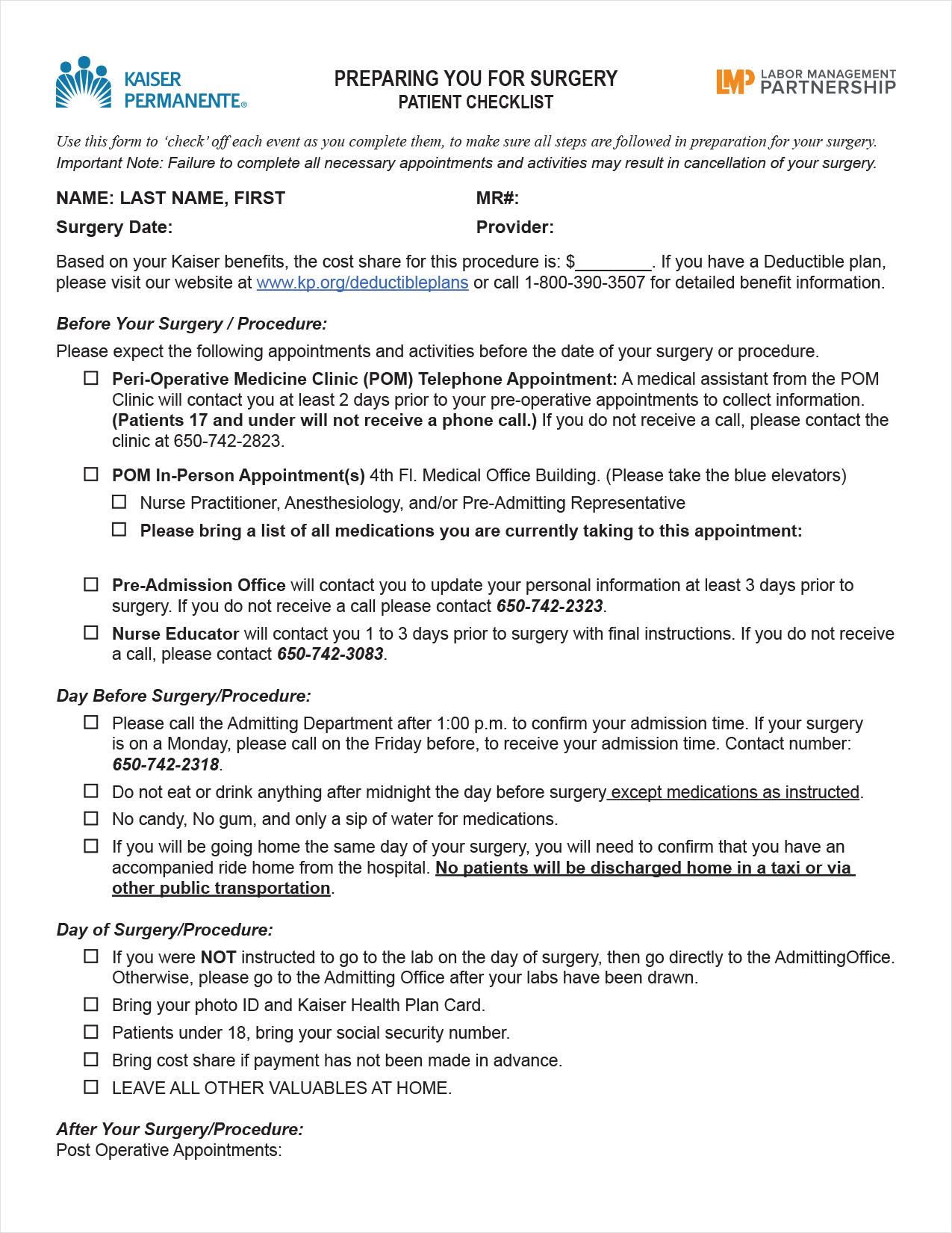 Use this document as a model to consider how your facility might revamp the presurgery process and create your own one-page checklist for patients.