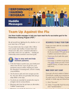 Use these huddle messages to help your team meet the flu vaccination goal for the Performance Sharing Program. Flu vaccination PSP goals apply to Coalition-represented workers throughout Kaiser Permanente and Alliance-represented workers in Hawaii, Mid-Atlantic States and Southern California. Georgia has a quality PSP goal that includes flu vaccination.