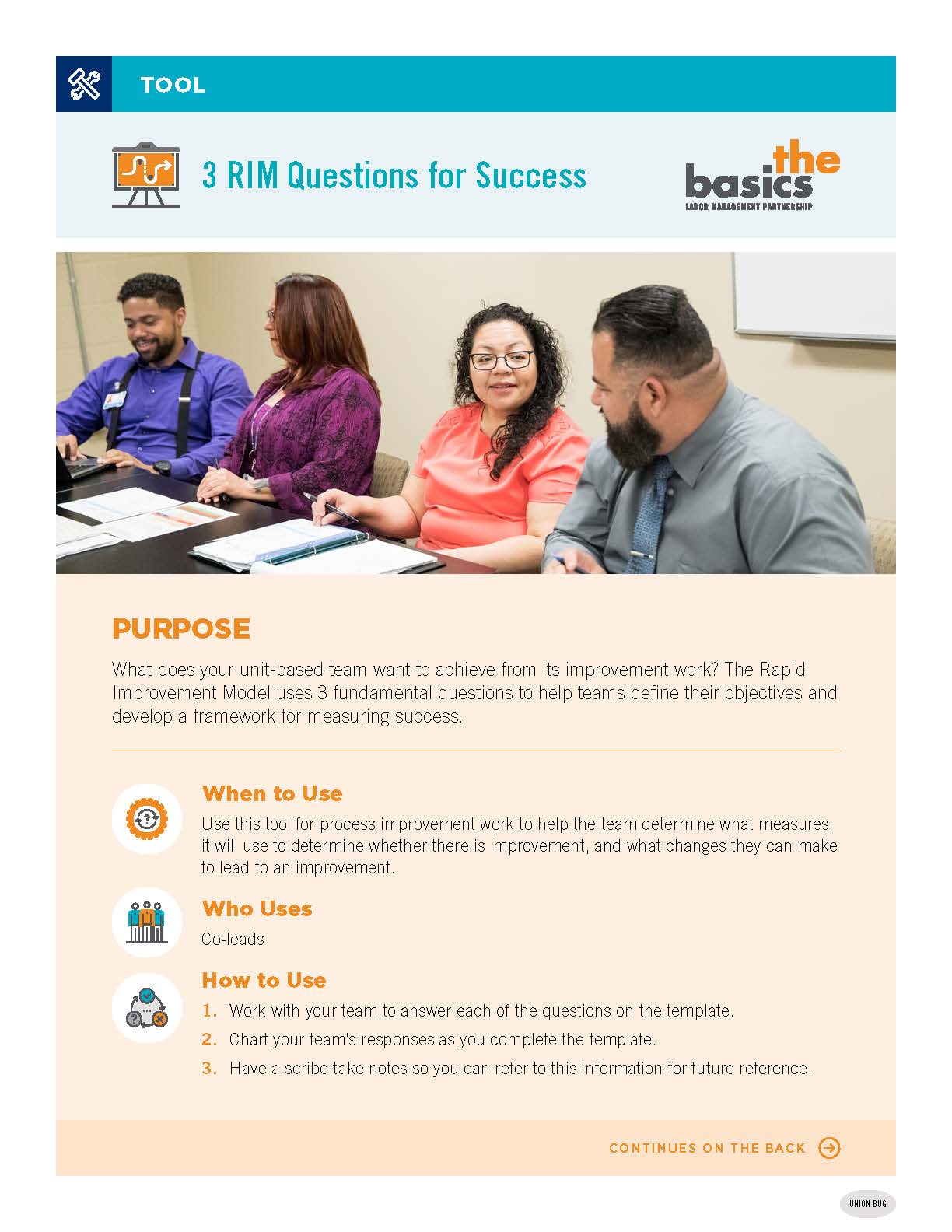 Use this tool for process improvement work, using the three fundamental questions of the Rapid Improvement Model. Help team members name their improvement goals, decide what measures they will use to determine whether there is improvement and identify changes they can make to lead to an improvement.