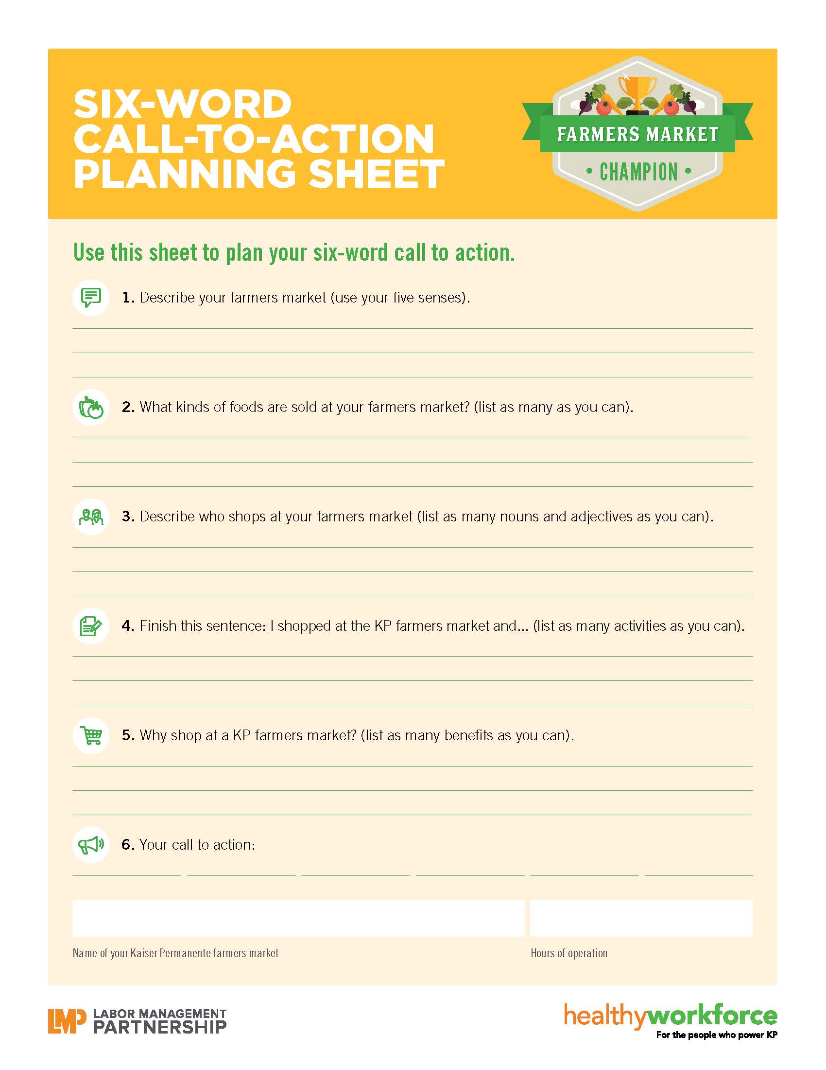Use this planning sheet to create a compelling six-word call to action for your farmers market.