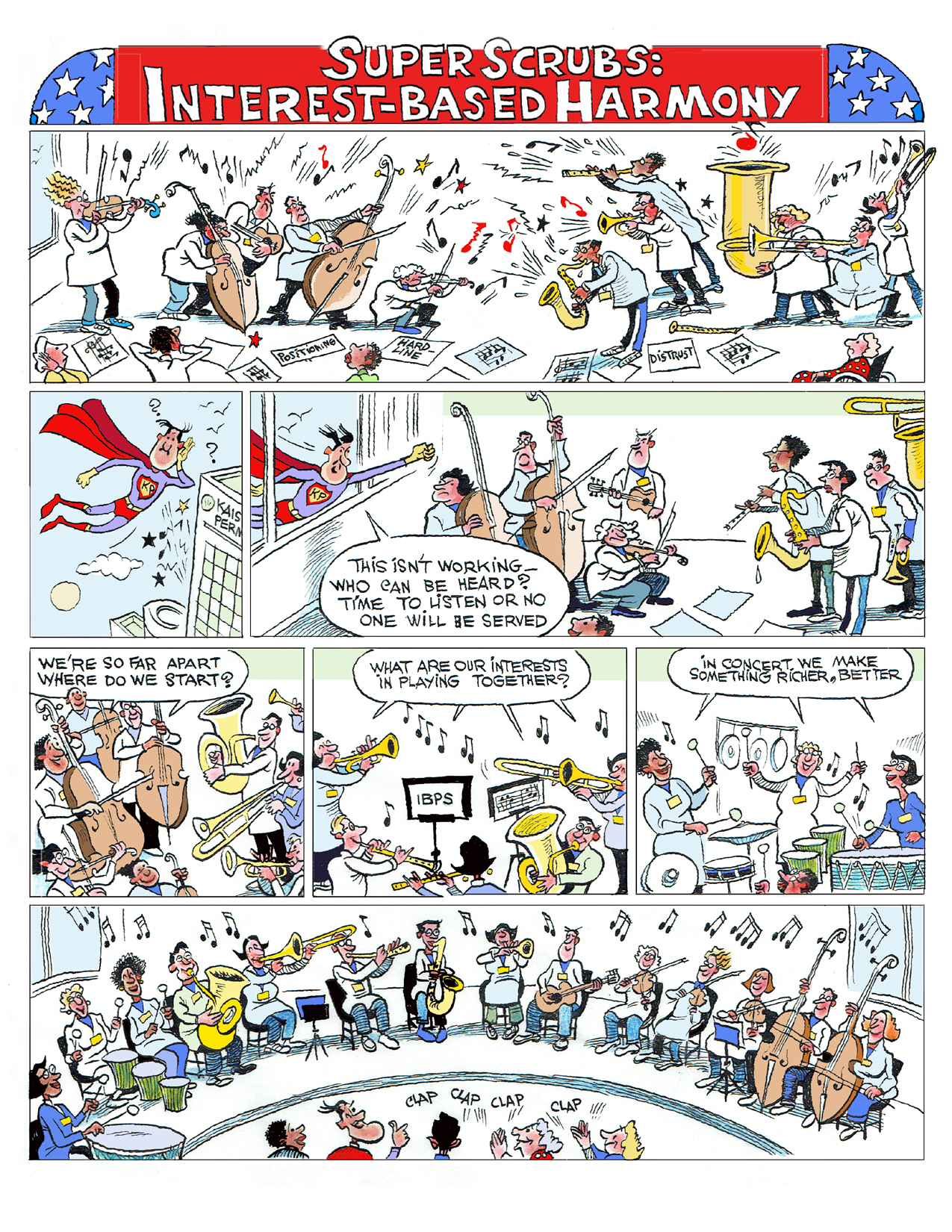 This full-page comic features Manny helping orchestrate harmony by encouraging everyone to discover their common interests. Enjoy, and appreciate the value of interest-based problem solving.