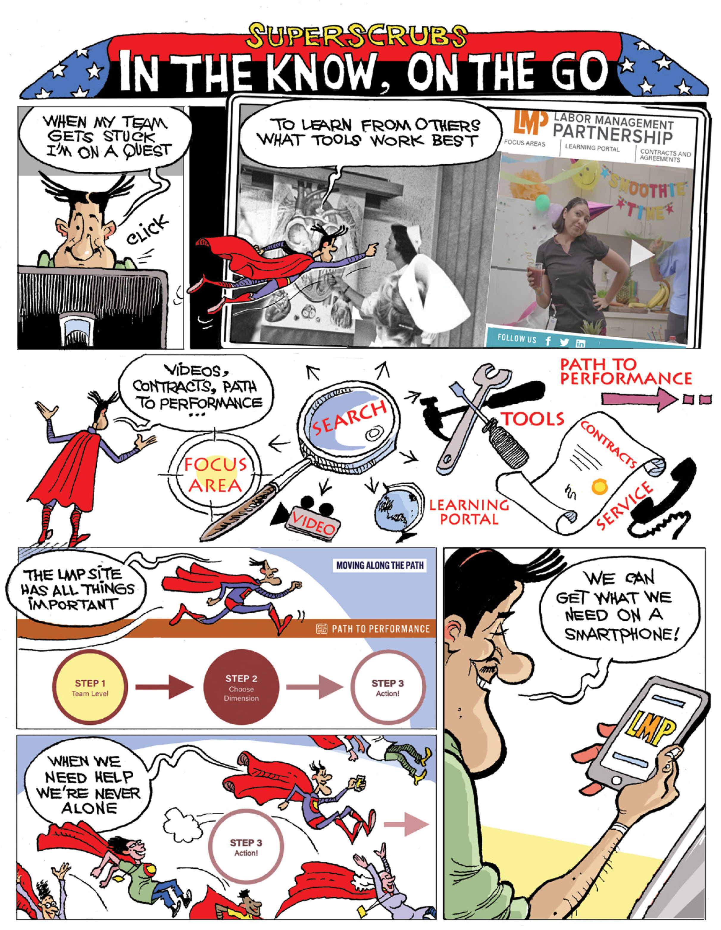 Our comic superhero demonstrates that you can be in the know while on the go using your smartphone.
