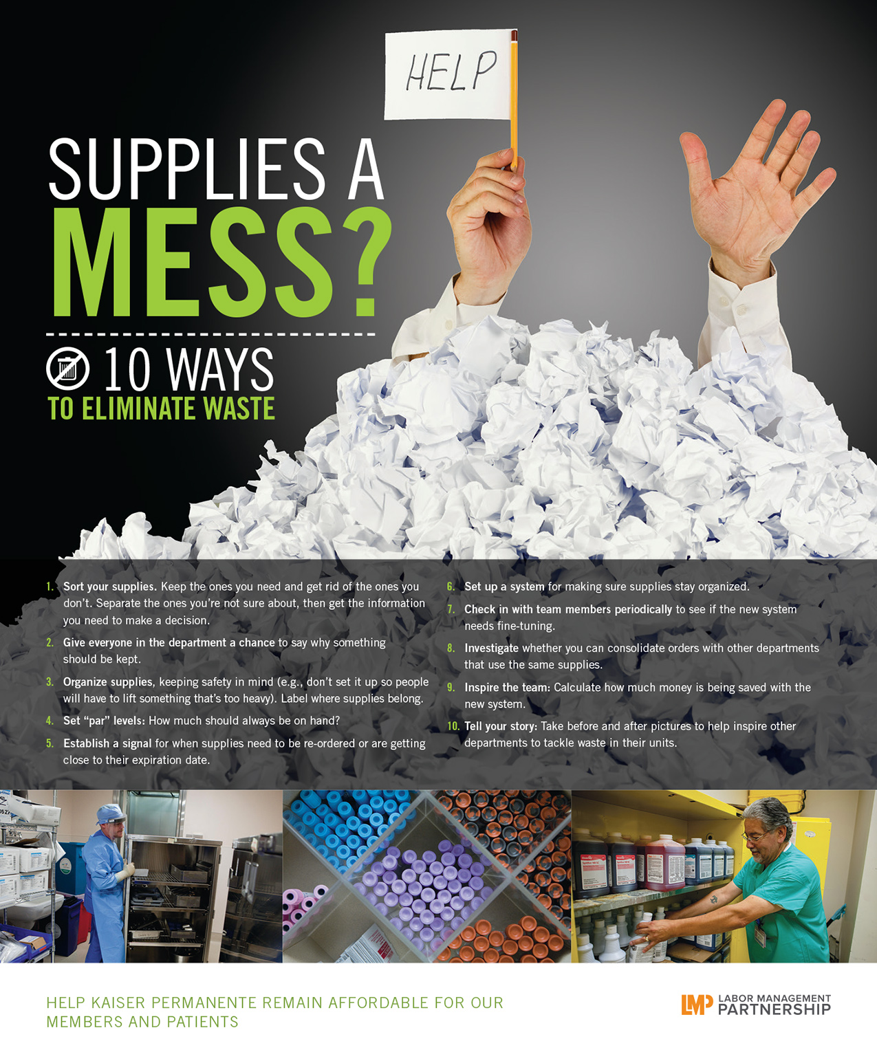This poster lists 10 ways to eliminate waste. Post on bulletin boards in break rooms and other staff areas.