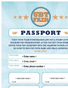 Download and hand out these passports at your UBT fair to ensure participants visit several teams (passports come in a six-team and a four-team version). Teams presenting at the fair can mark off participants’ passports with a pen or colorful sticker. Participants can redeem the passports for snacks or giveaways. Also use the passports as tickets for raffle drawings at your event.