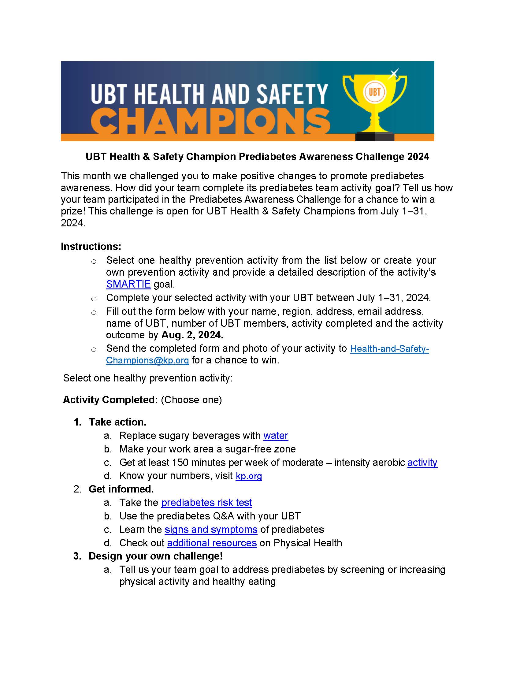 Enter the UBT Health and Safety Champions Prediabetes Awareness Challenge 2024. Become eligible to win prizes while raising awareness of ways to better health.