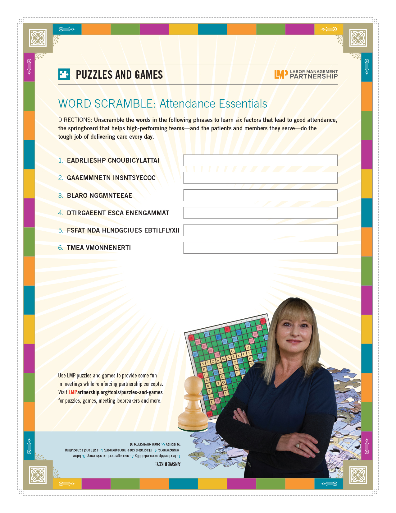 To provide some variety and fun at a team meeting. This word scramble underscores concepts about attendance.